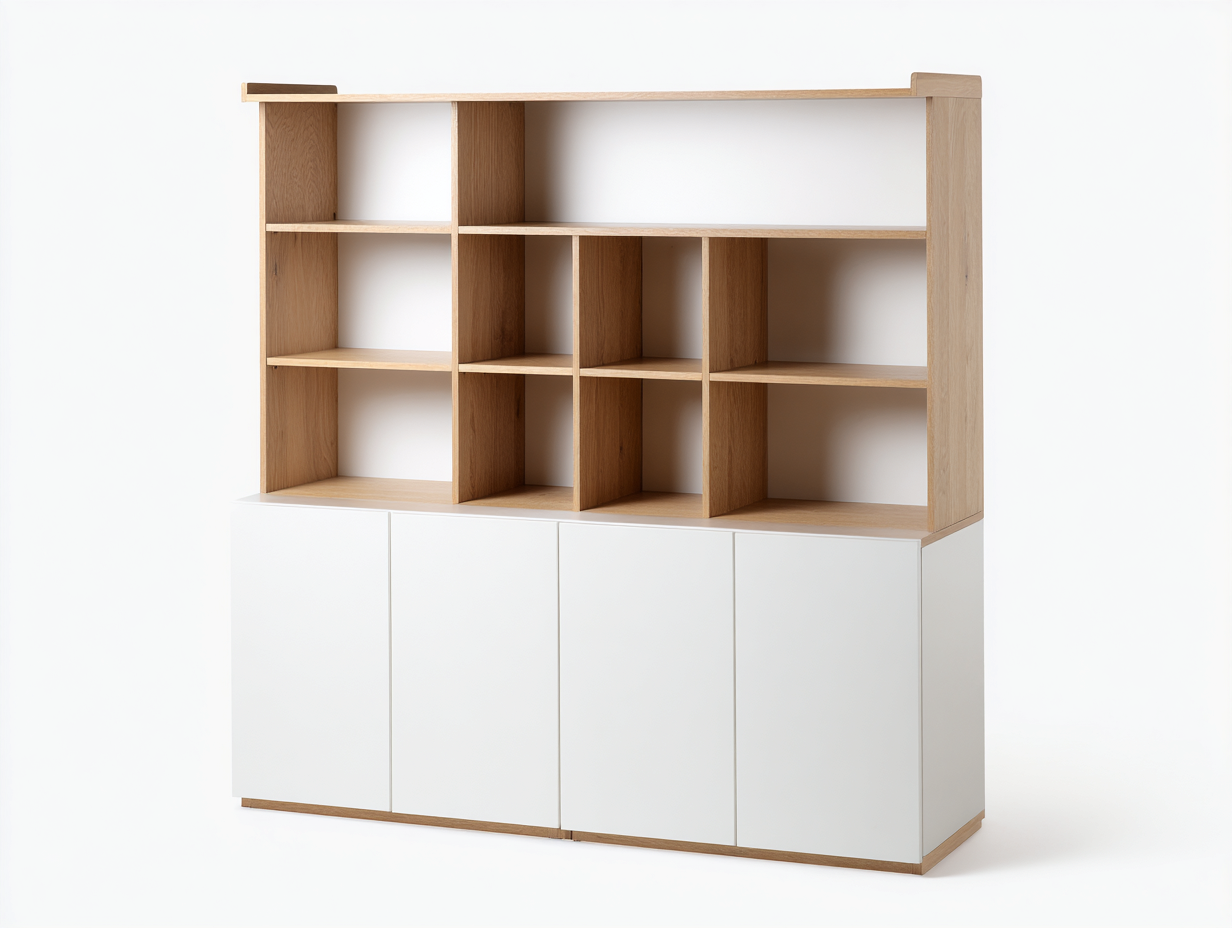 Fabricada en madera con acabado en color roble y blanco. La estructura superior presenta compartimentos abiertos mientras que la parte inferior cuenta con puertas lisas que aportan un aspecto limpio y ordenado.